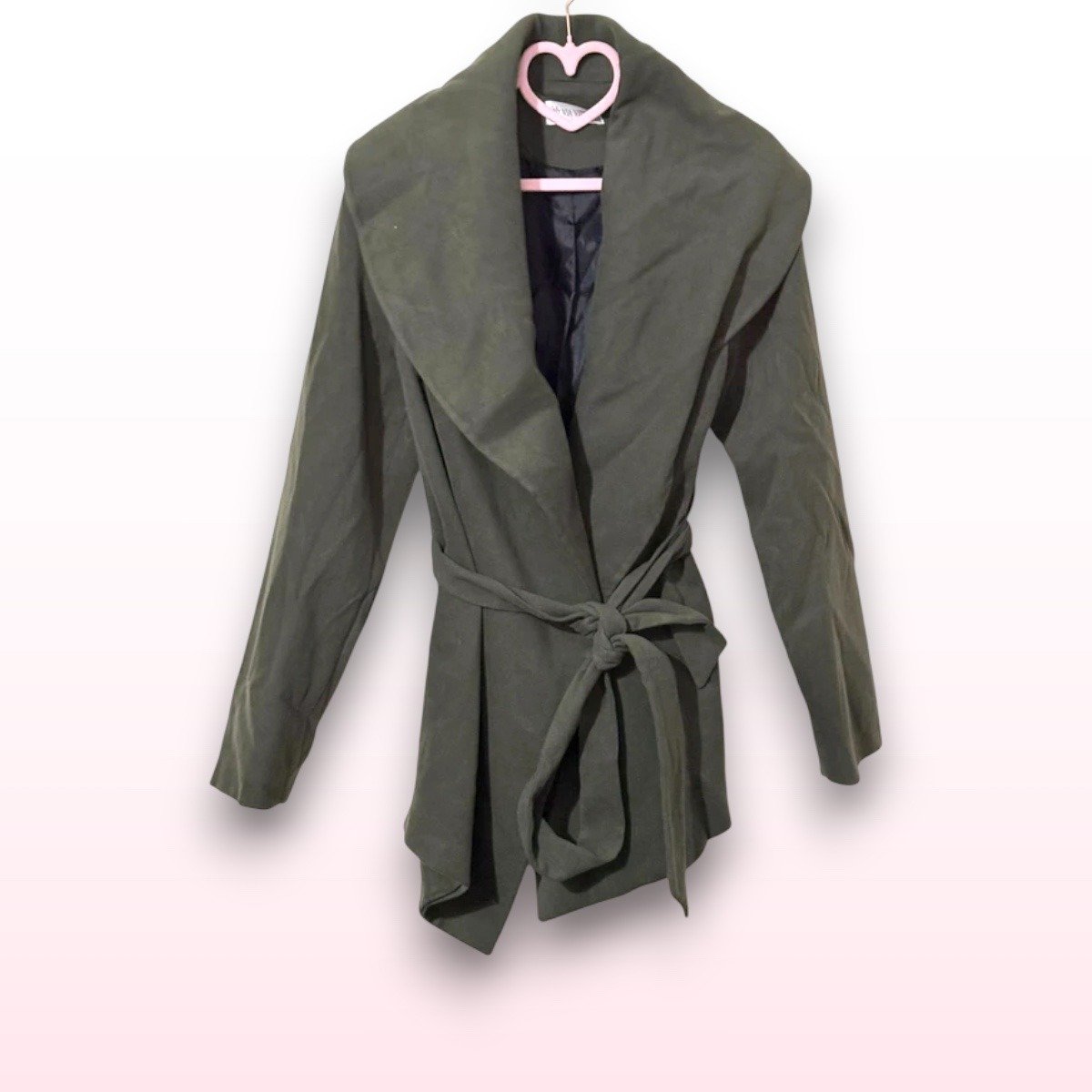 A beautiful khaki Grey colour wool wrap coat with a flattering waterfall front that drapes effortlessly when worn. Soft, warm and easy to style — perfect for layering through cooler seasons.